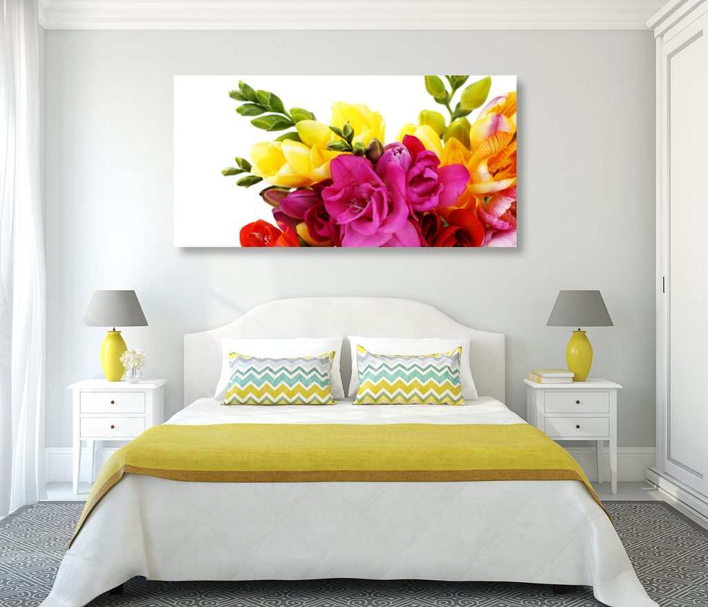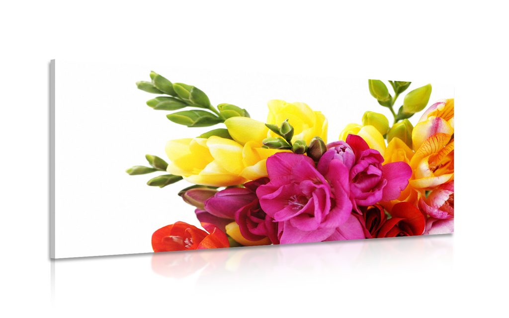 Obraz kytice frézií zachycuje nádherné květiny v plném rozkvětu. Různé odstíny růžové, žluté a červené se prolínají s jemnými zelenými listy, což vytváří živý a radostný dojem. Celková atmosféra je veselá a osvěžující, ideální pro oživení jakéhokoliv interiéru. Tento obraz se skvěle hodí do obývacího pokoje nebo pracovny, kde dodá prostorům na eleganci a šarm. Kvalitní tisk na plátně zaručuje dlouhou životnost a stálost barev, což z něj činí skvělou investici do vaší výzdoby.