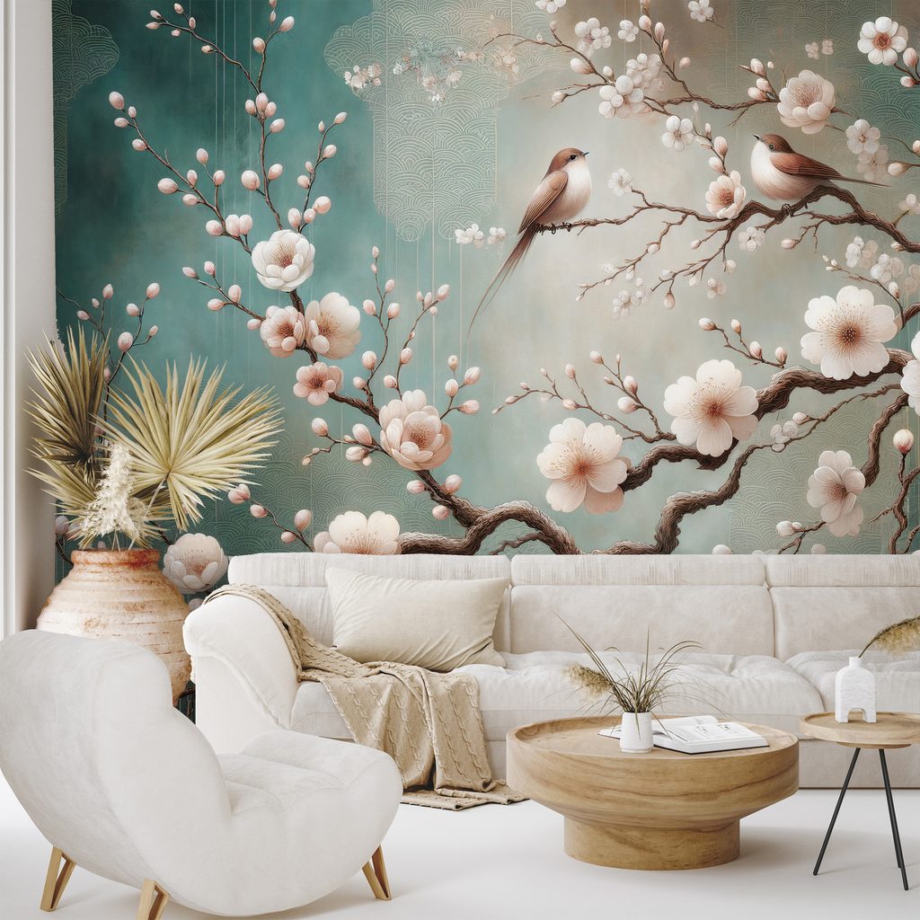 Samolepící tapeta jemné květy a ptáčci na větvích