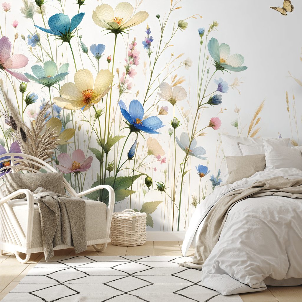 Samolepící tapeta pastelové květiny a létající motýli